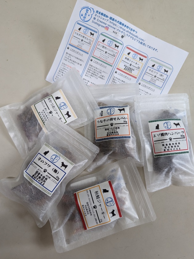 何の看板犬かというと、ママさんが始めたワンニャンの無添加手作りおやつのお店、その名も『柴友堂』がフリマに出店したからです。