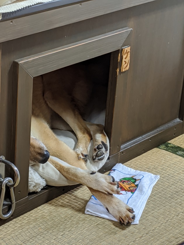 購入した当初はほとんど入ってくれなくて、ケンのおもちゃ箱と化していましたが、今は雷が鳴ったら逃げ込んだり、シャンプーを察したら父ちゃんの手から逃れて隠れ潜んだりしています。