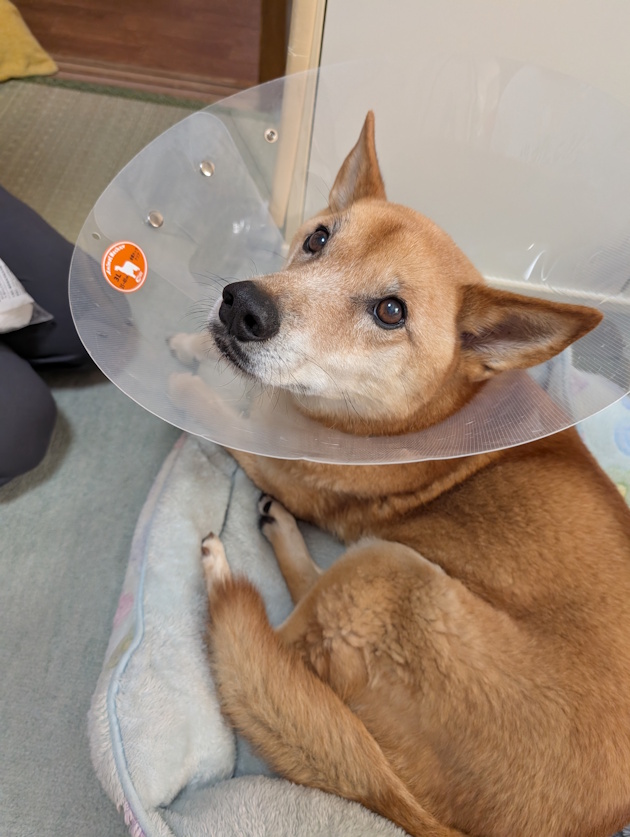 じゃあコレするよ、と病院で貸してくれたエリザベスカラーを装着。