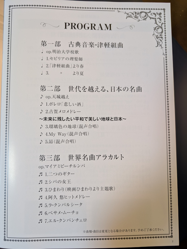 年配者向けなのか、少し地味目なプログラムでしたが、ラテン系の曲にはマンドリンの哀愁漂う音色がよく合っていて演奏は素晴らしかったです。
