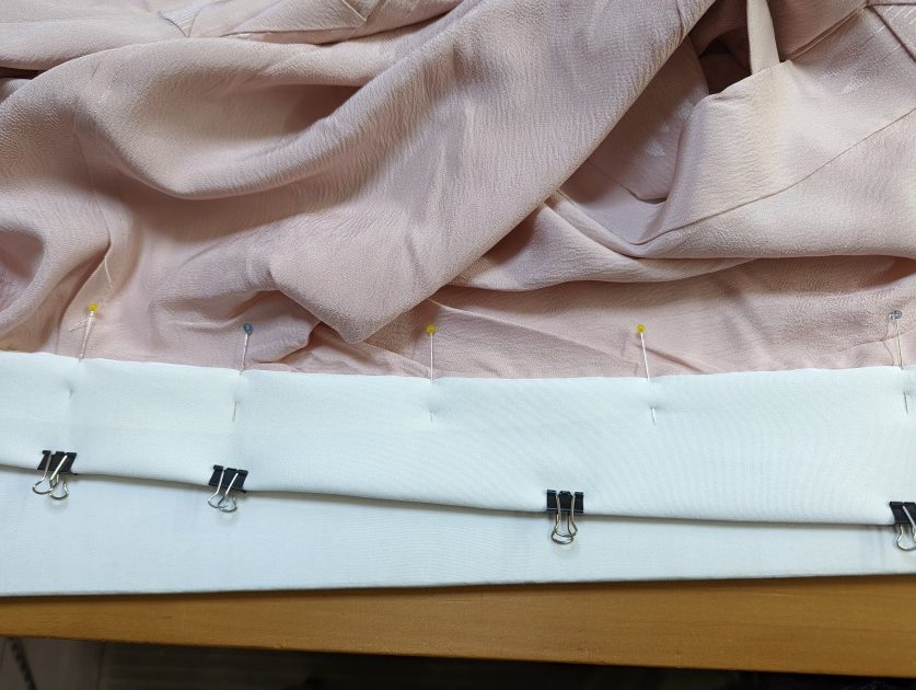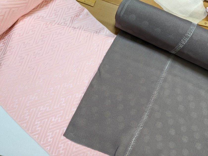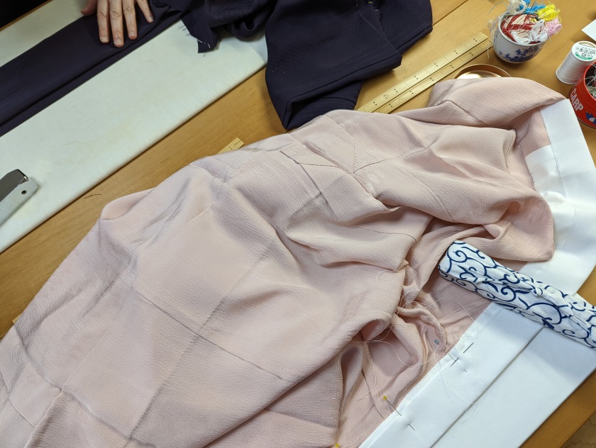 渋い梅鼠色の着物地と若いピンクの振袖用の襦袢地で2枚同時進行、頑張ります。