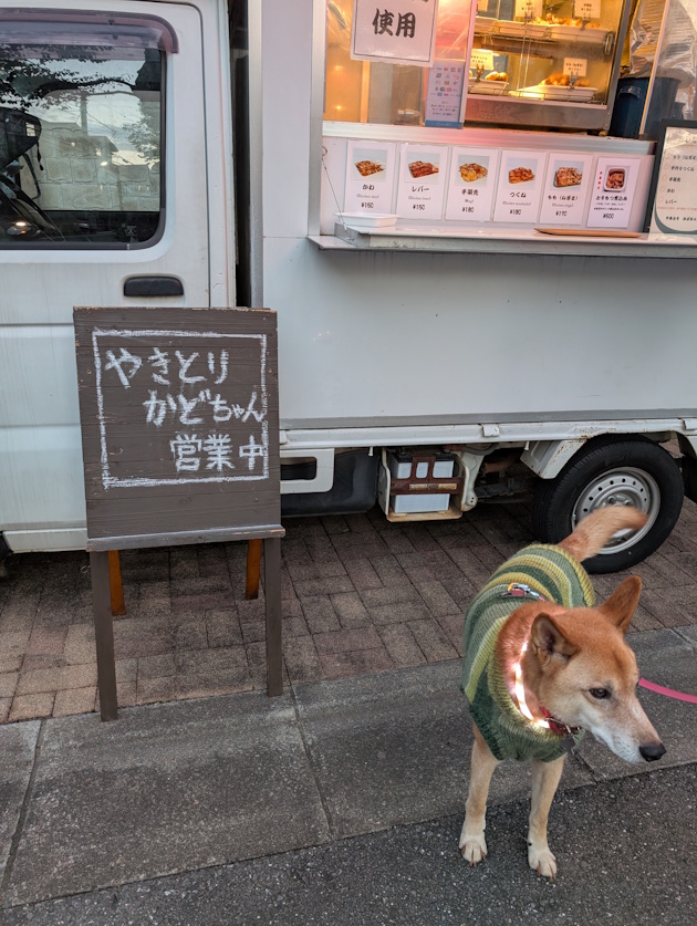 とちゅうで焼き鳥のキッチンカーを見つけ、今夜のおかずの一品に各種1本ずつ購入。