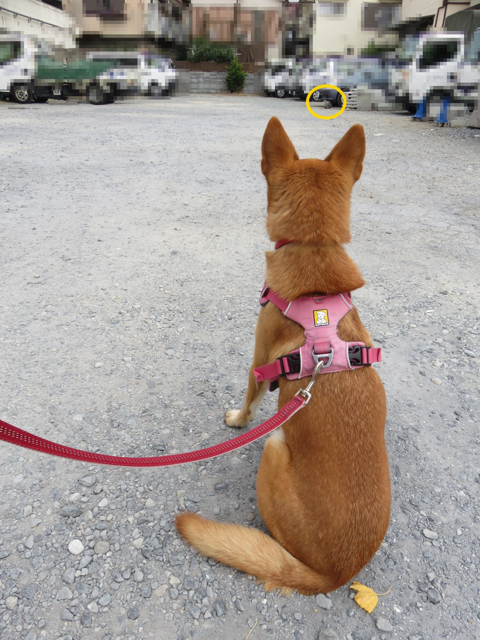 駐車場の真ん中で、奥の方にいるにゃんこにテレパシーを送っています。