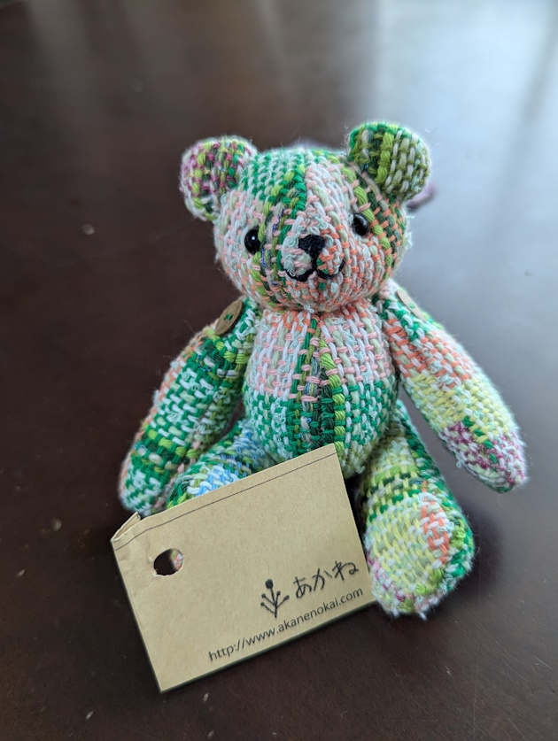 さをり織りの生地で作られた口角がきゅっと上がったくま子ちゃん。