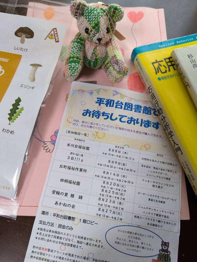 近所の図書館では、定期的に福祉作業所の作品を展示販売しています。