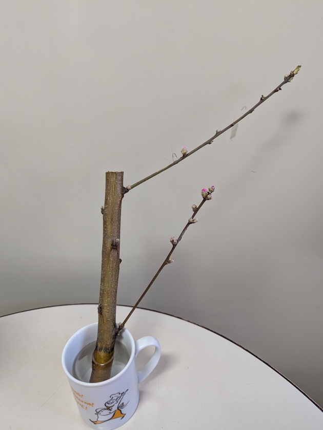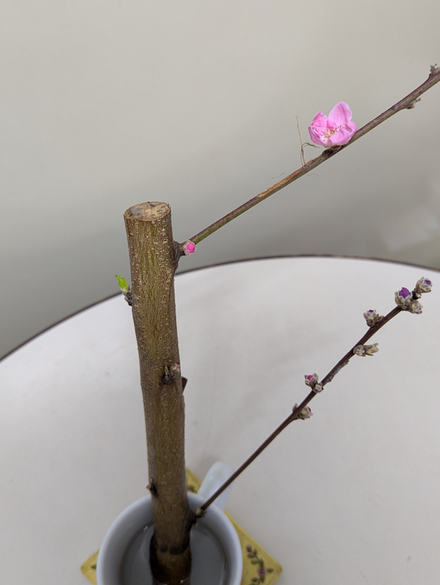 前回の梅の枝のつぼみは全く大きくなる気配なく、スッと伸びた枝の風情だけを楽しみましたが、今回は望みがありそうで、