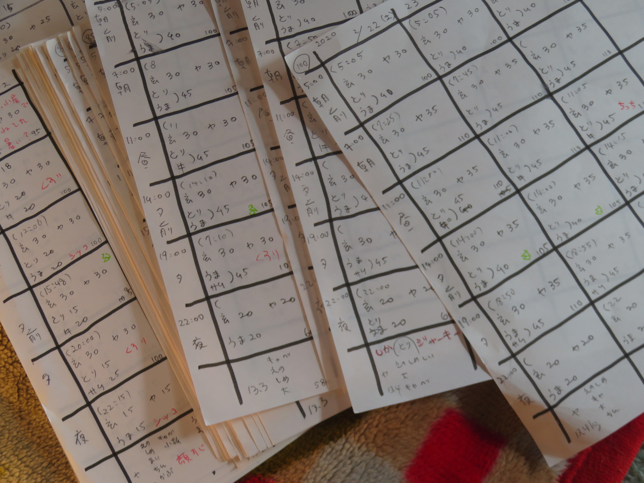 何をどのくらいあげてるか、体重、おトイレ、気になる様子など書き込んだ紙の束。