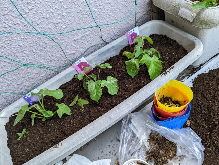 勝手に咲いてくれる朝顔が青系なので、ピンク系の苗を仕入れてきました。